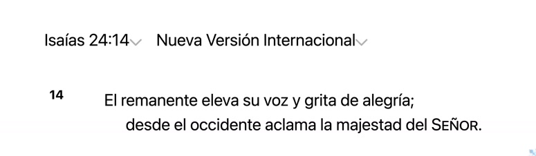 Isaías 24:14 (JBS)Estos alzarán su voz; cantarán gozosos en la grandeza del SEÑOR, desde el mar darán voces.